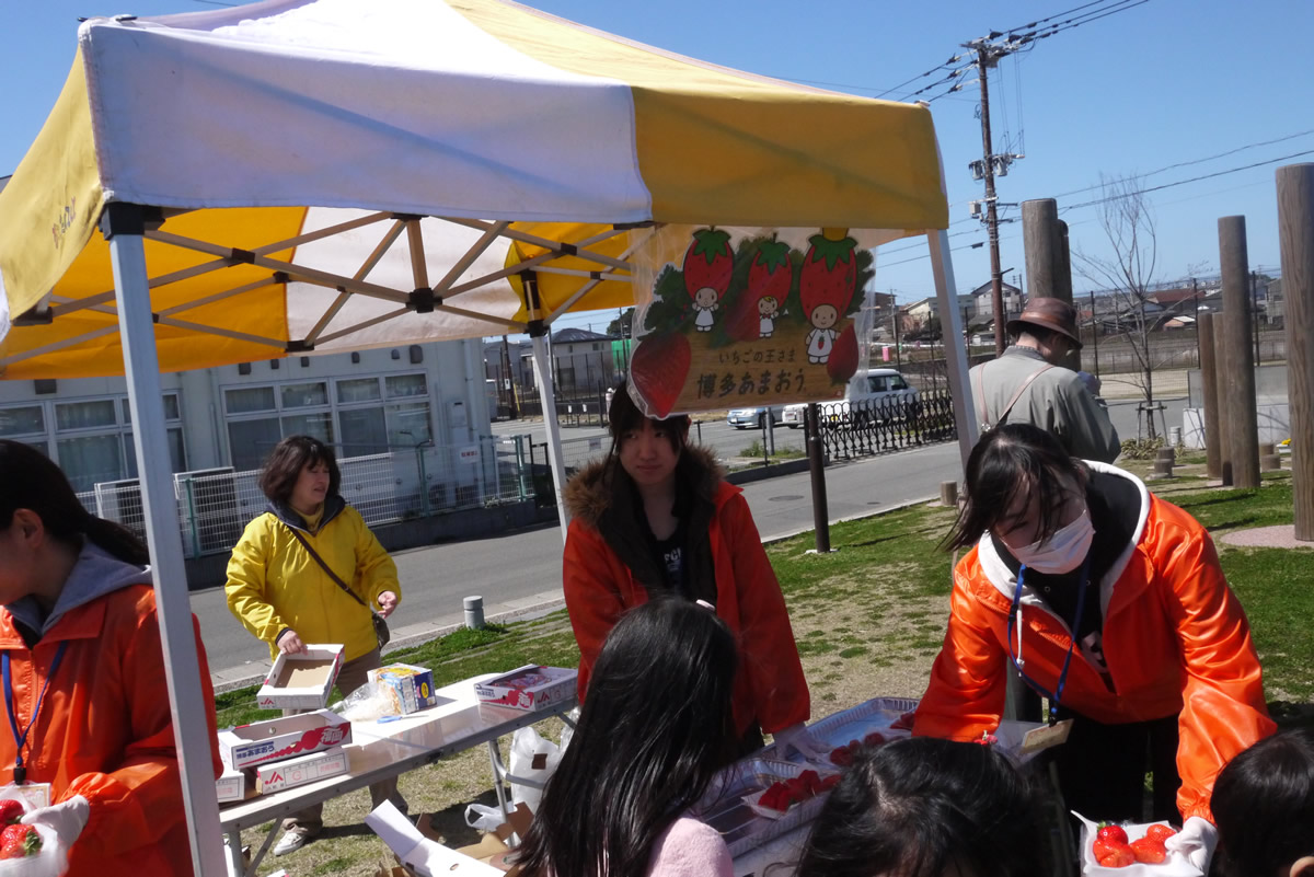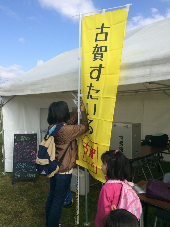 古賀すたいるのブースでは、まゆこちゃんが、のぼりを立ててくれてます。風が強かったので、ちょっと心配。
