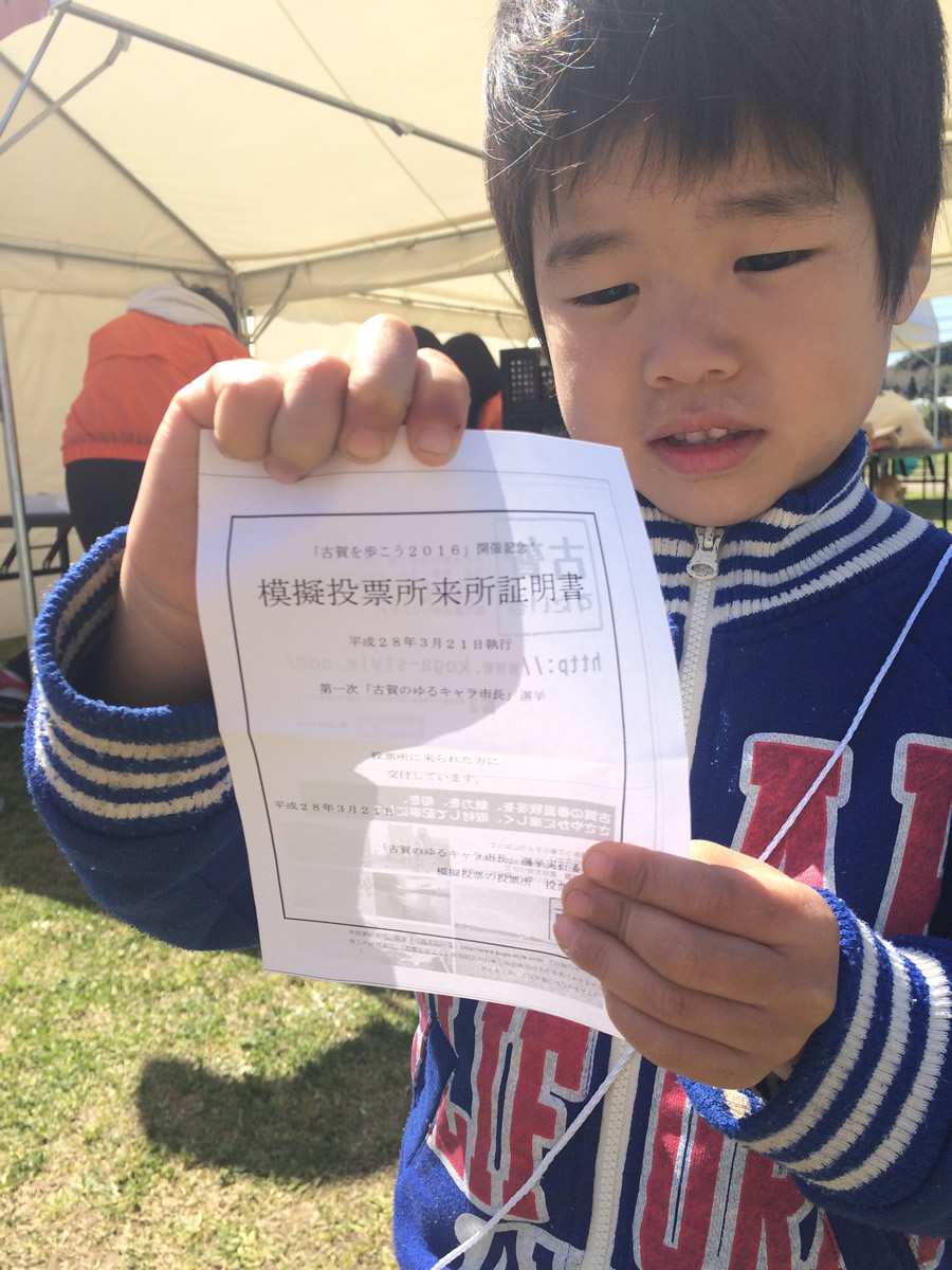 古賀すたいるブースでは、ゆるきゃら総選挙をしておりましたので、息子も投票して、来所証明書をもらってました。
