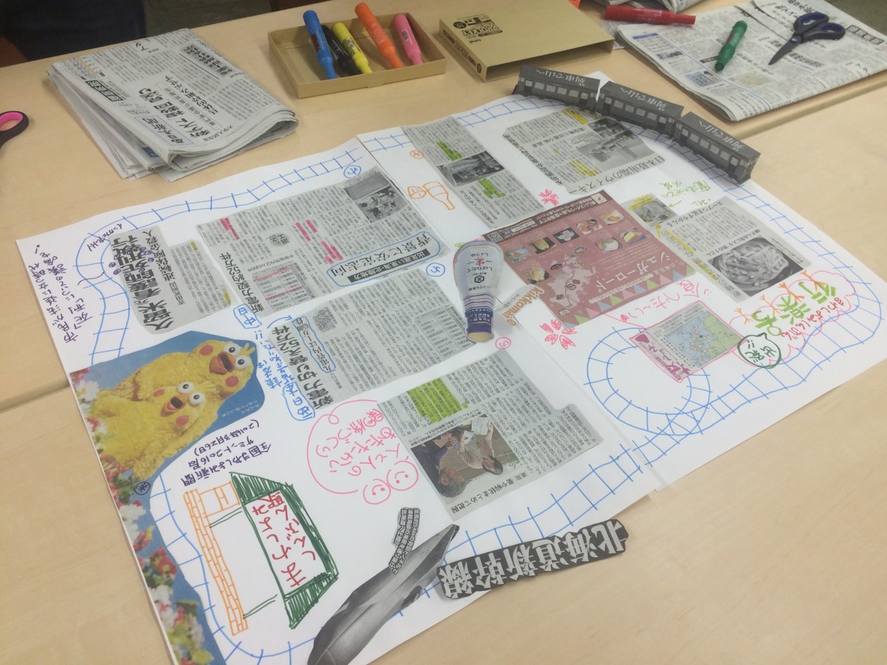 このテーブルでは、日本地図をつくって、そこに記事を貼っていこうという斬新な考えで紙面を製作。なんでも、面白がるって素敵。
